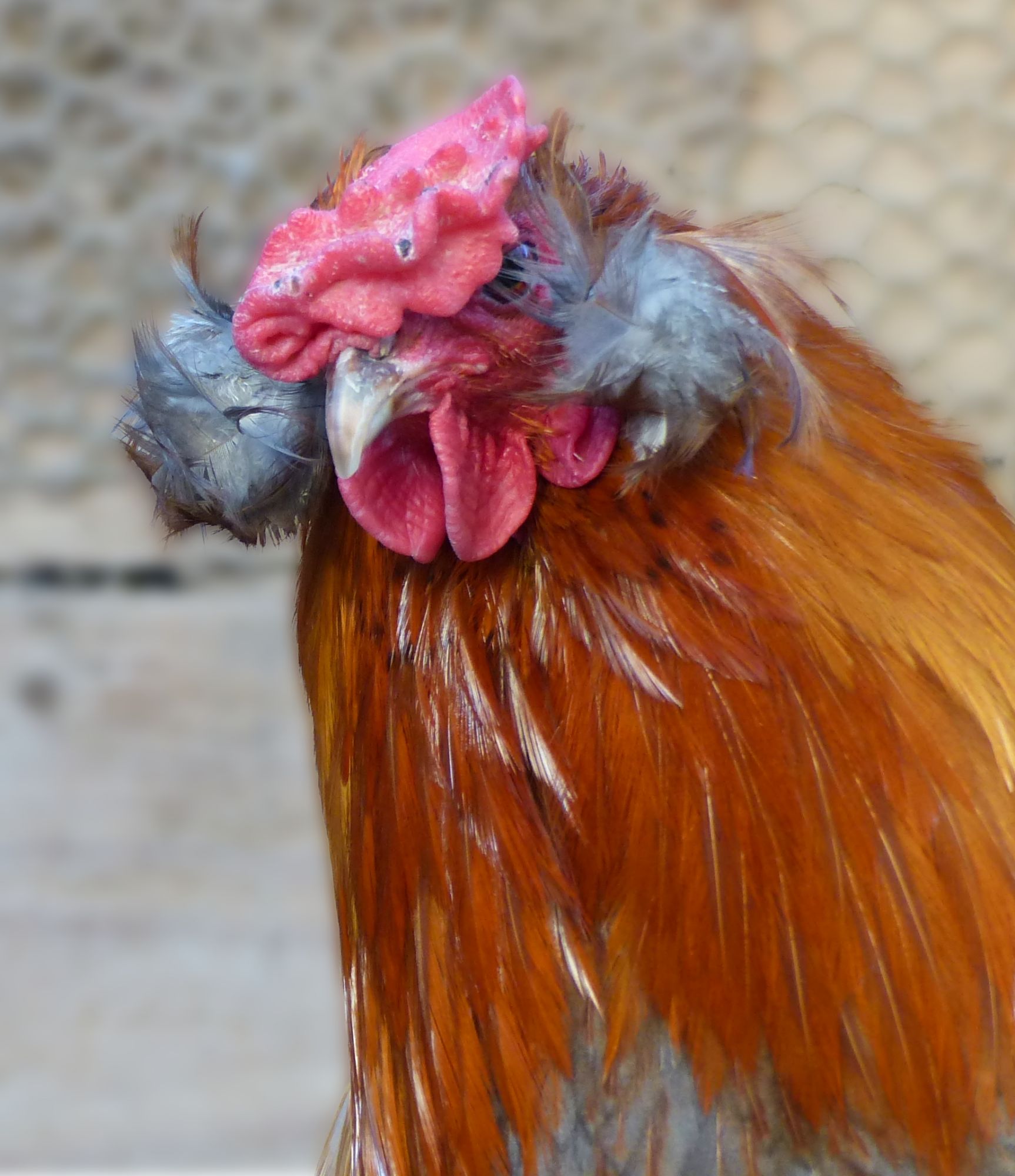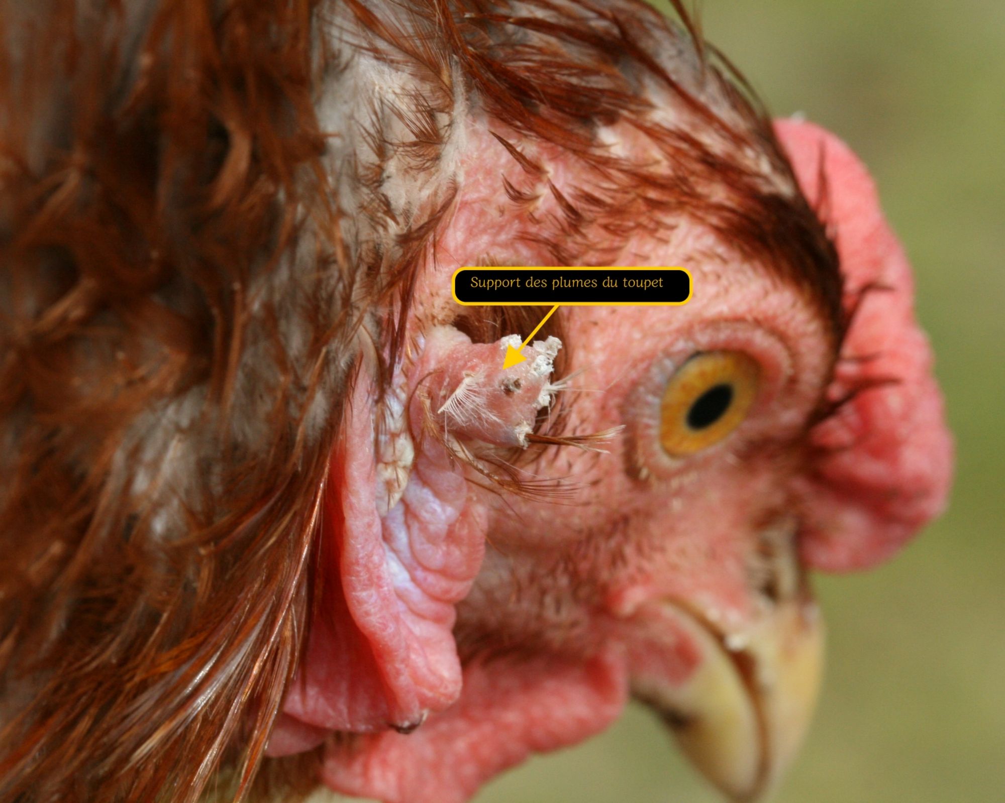 Autre particularité : la présence de toupets d'oreilles. C'est un petit bouquet de plumes porté par un petit appendice de chair à proximité des oreilles (voir les photos). Tous les individus n'en portent pas. C'est même très difficile d'obtenir des sujets avec deux toupets bien équilibrés. Ces sujets sont très rares. On a plus souvent des toupets déséquilibrés, un seul toupet, un toupet qui tombe au lieu de monter, ou pas de toupets du tout ! Cas le plus fréquent car le gène qui gouverne la présence de toupets est létal (mortel) lorsqu'il est homozygote. Celui qui gouverne l'absence de queue aussi, ce qui fait qu'obtenir des poussins araucanas est plus difficile que dans des races ne présentant pas toutes ces "fantaisies".