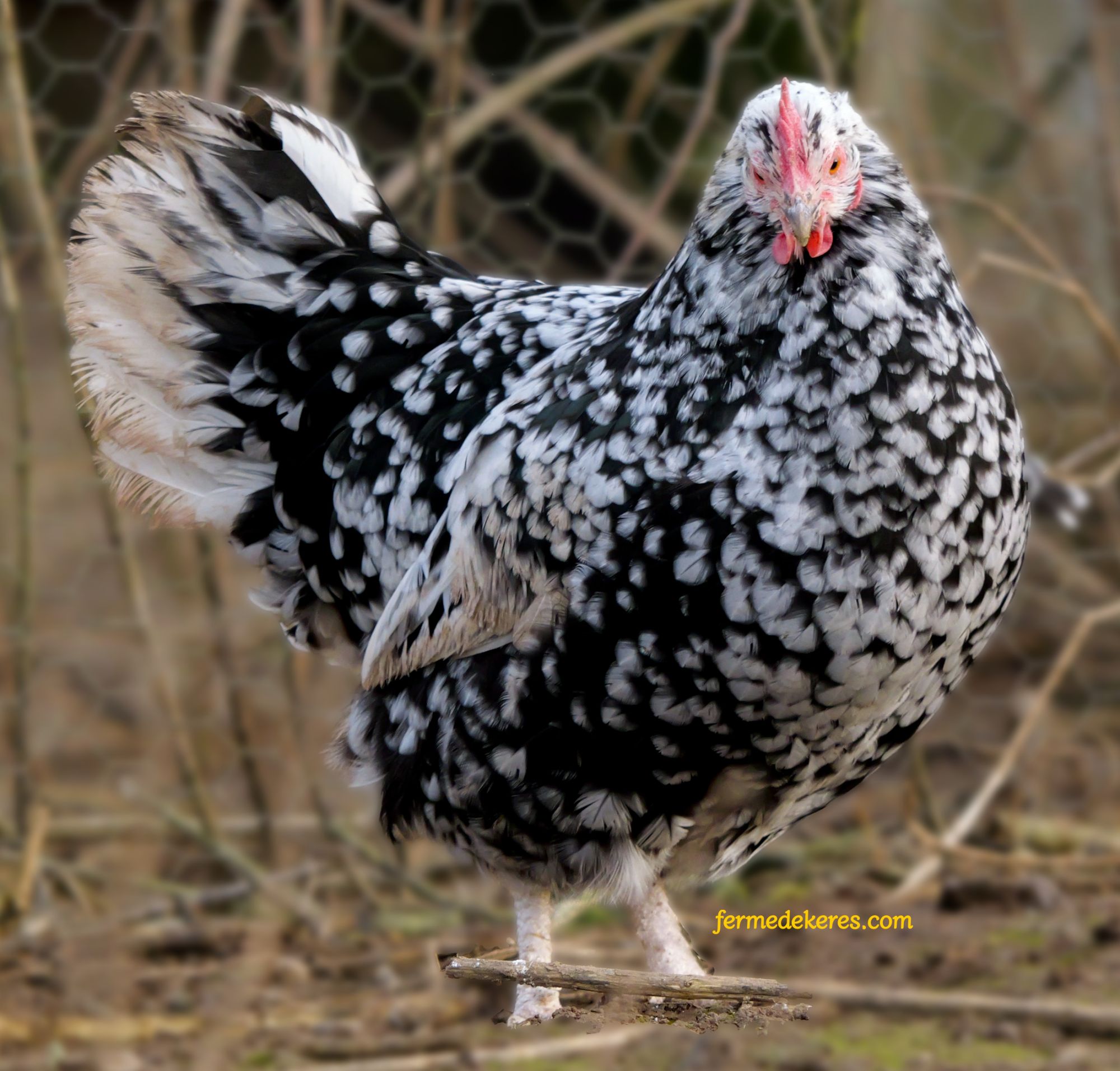 Rebaptisé "noir caillouté blanc", ce coloris se rencontre dans de nombreuses races de poules, grandes ou naines.